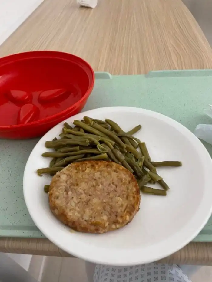 Ужин: бургерная котлета и зелёная фасоль. Без соли. 10/10, так как это мой первый приём пищи за 4 дня, но на самом деле 5/10.