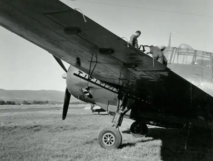 9. Штанга опрыскивателя на опрыскивающем самолете TBM, использованном в проекте по борьбе с еловой листоверткой в 1962 году в Вашингтоне. Джон Ф. Уир (слева) и Ч. Р. Финк на крыле.