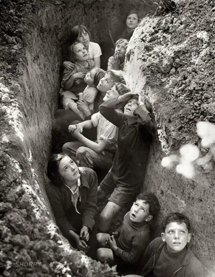 23. Дети с учительницей прячутся в окопе во время авианалета, Англия, ок. 1941 года