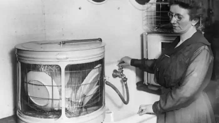 27. Изобретательница посудомоечной машины Жозефина Гарис Кокрейн со своим изобретением, США, 1892 год.