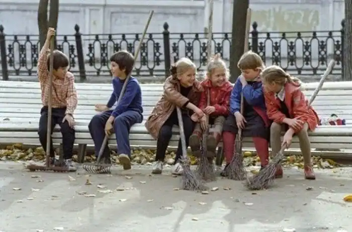 24. Школьники отдыхают во время субботника. Москва, осень 1983 года