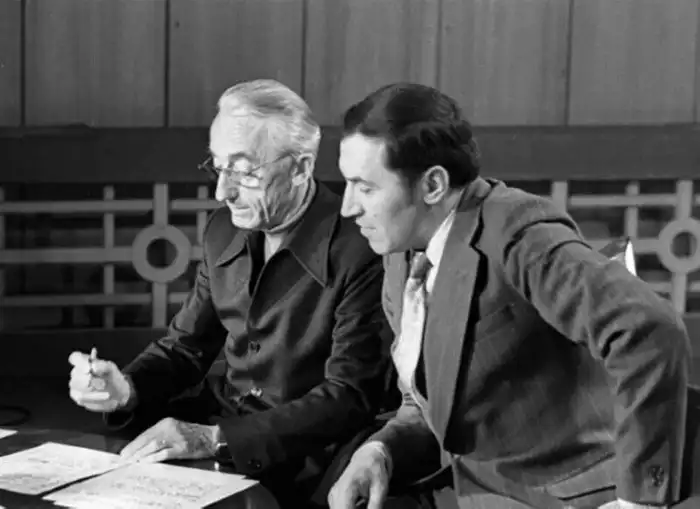 28. Николай Дроздов и первый гость передачи "В мире животных" Жак Ив Кусто, г. Москва, 1977 год