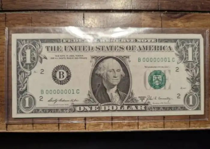 2. Долларовая банкнота 1969 года выпуска с серийным номером 1