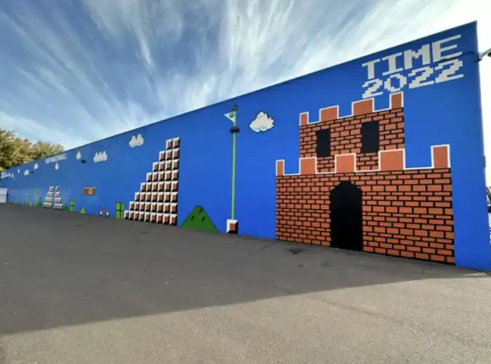 10. Первый уровень игры "Марио", нарисованный на стене здания