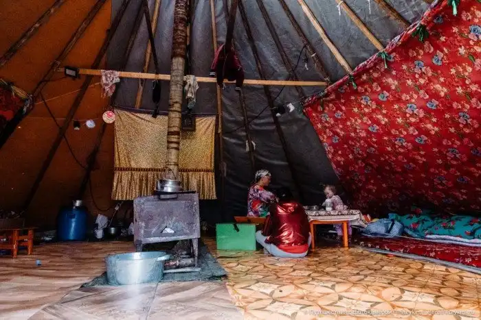 Мебели в чуме минимум, ведь всё это потом надо собирать и перевозить с собой. Поэтому стол на очень низких ножках, табуретки тоже. А сидеть чаще всего приходится на матрасах, лежащих на полу.