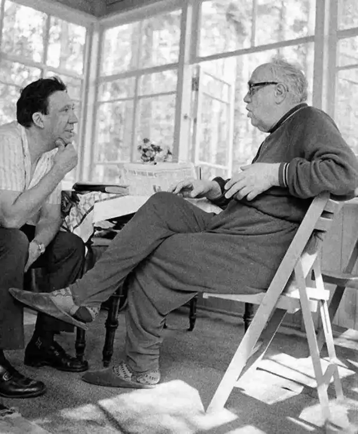 9. Художник-постановщик киностудии «Азербайджанфильм» Фикрет Алекперов и актриса Анастасия Вертинская на съемках фильма «Человек-амфибия». Баку, 1961 год