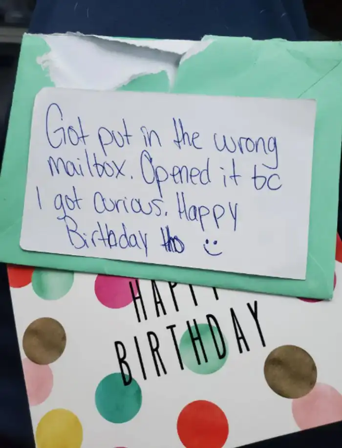 "Письмо положили по ошибке в мой ящик. Я его открыл, потому что мне стало любопытно. С днем рождения!"