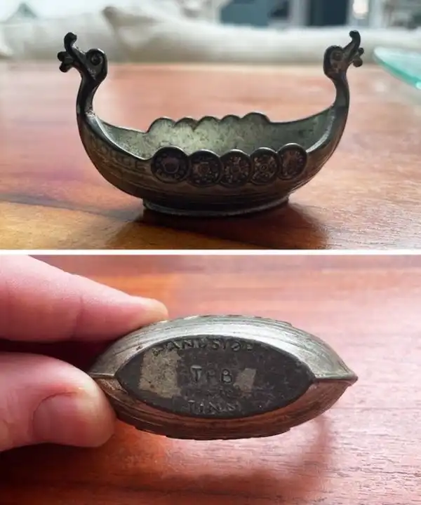 Ответ: это солонка из олова. Довольно распространенная вещь в Норвегии, вероятно, куплена туристом из Новой Зеландии, который привез ее домой. Обычно они идут в комплекте либо с парусом, либо с маленькой ложкой.