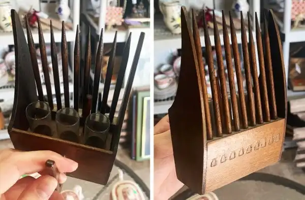 Деревянный инструмент с гребенчатыми зубцами, 3 стеклянными пузырьками и маленькой ручкой