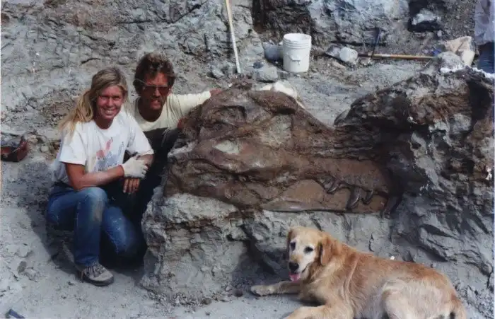 Палеонтологи, Питер Ларсон и Сью Хендриксон, позируют рядом со "Сью", тираннозавром, наиболее полным и сохранившимся из всех известных находок. Они обнаружили его случайно, во время поездки в Южную Дакоту