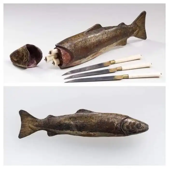 Набор ножей эпохи Возрождения из кости и железа в футляре в форме форели - итальянская работа XVII век