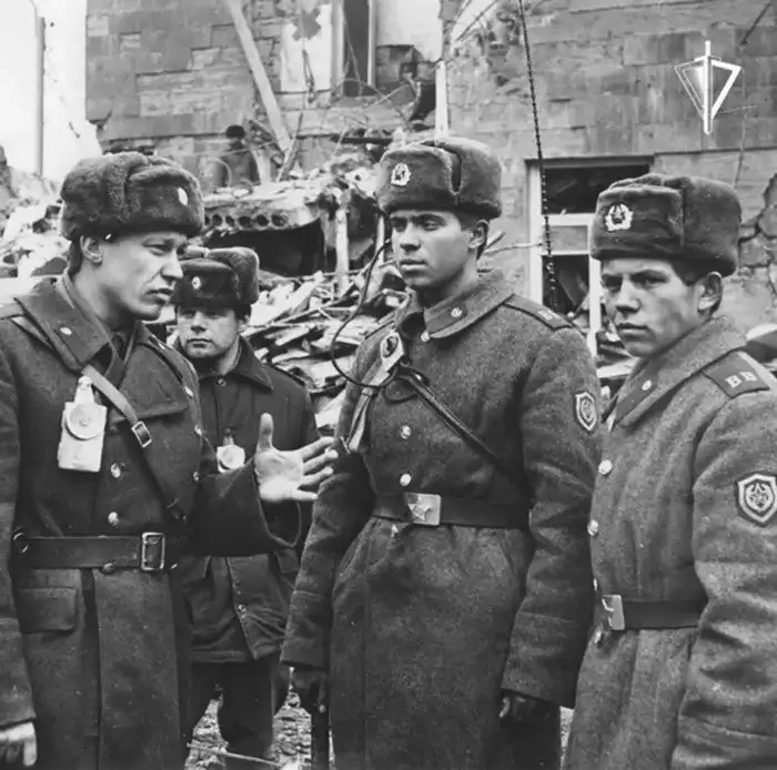 14. Военнослужащие внутренних войск МВД СССР обеспечивают охрану общественного порядка в зоне катастрофического землетрясения в Армянской ССР. Ленинакан, декабрь 1988 год