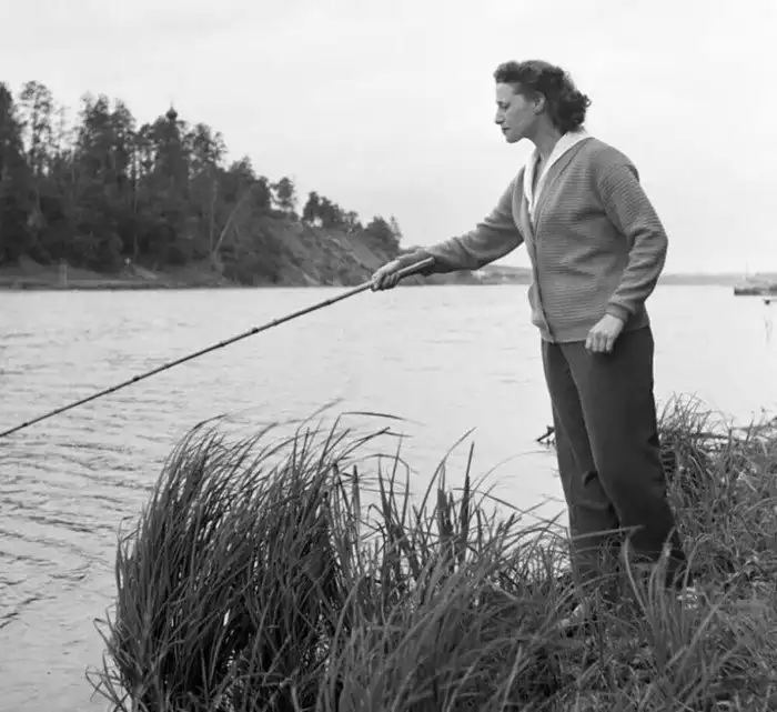 17. Майя Плисецкая ловит рыбу на берегу Москвы-реки, 1956 год. Фото Е. Умнова