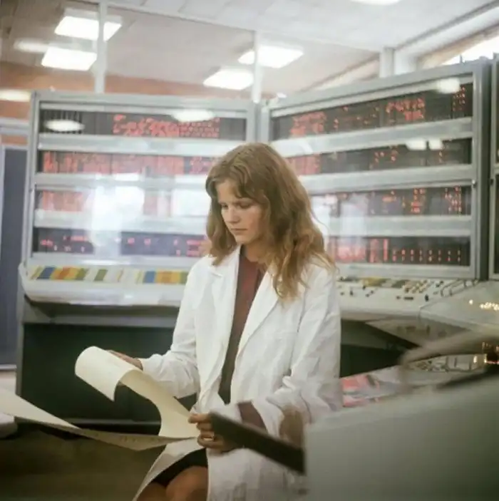 30. Оператор Ниоле Ядзявичюте изучает данные ЭВМ БЭСМ-6 в вычислительном центре. Литва, СССР, 1974 год