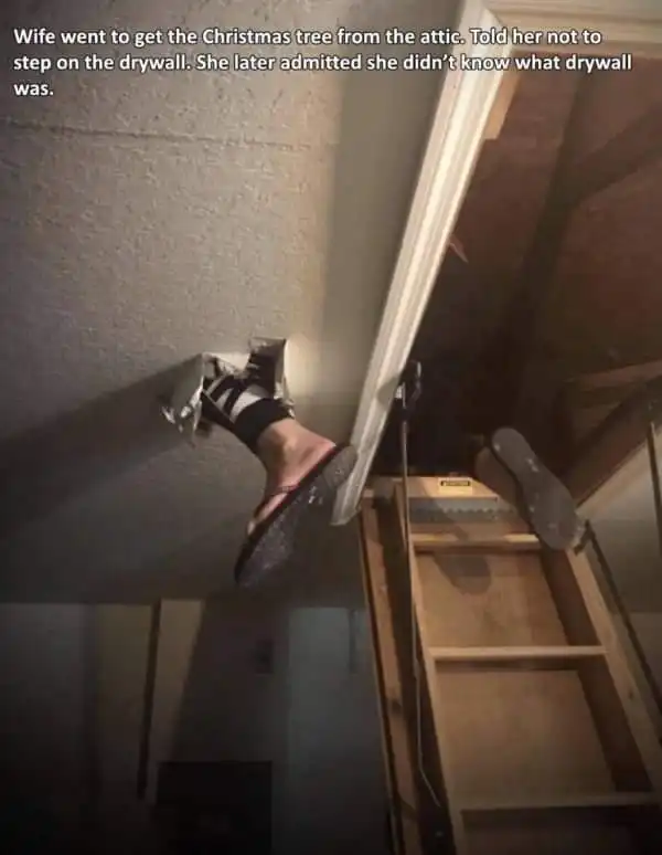 "Жена отправилась за ёлкой на чердак. Я предупредил её, чтобы она не становилась на гипсокартон. Позже она сказала, что понятия не имела, как он выглядит."