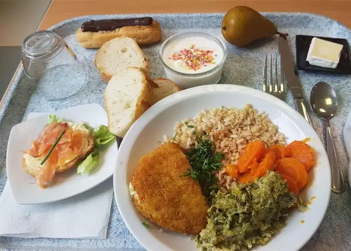 2. Бесплатный школьный обед в Швеции. Жареный лосось, жареный картофель в травах, запеченные в меду овощи с козьим сыром