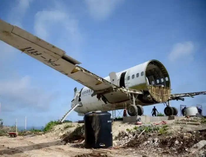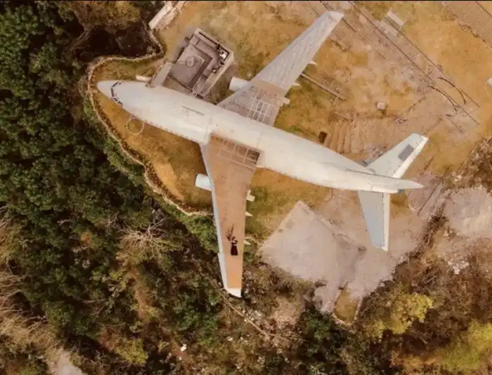 Одно из крыльев самолета превратилось в террасу с мостом, который нависает над скалой