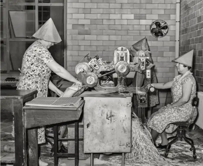 Женщины надели бумажные шапочки, чтобы остатки бумаги не попадали им в волосы.
