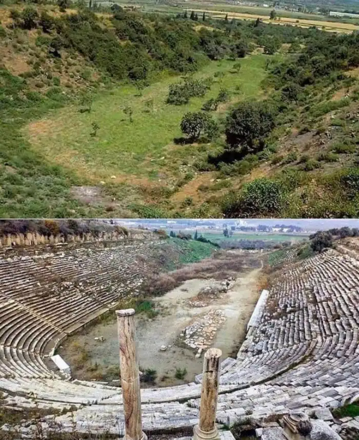 Древний стадион Магнезии в Турции до и после начала раскопок. Стадион был построен в 1 веке нашей эры и вмещал 40 000 человек