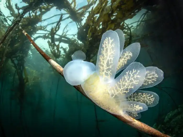 Необычный моллюск Melibe leonina на водоросли. Фотограф Veronika Nagy