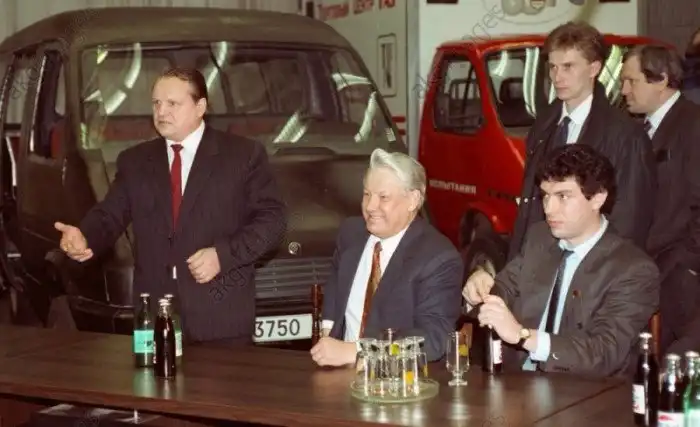 38. Президент России Борис Ельцин и губернатор Нижнего Новгорода Борис Немцов сидят за столом на встрече с руководством Горьковского автомобильного завода, Нижний Н. Январь, 1992 год