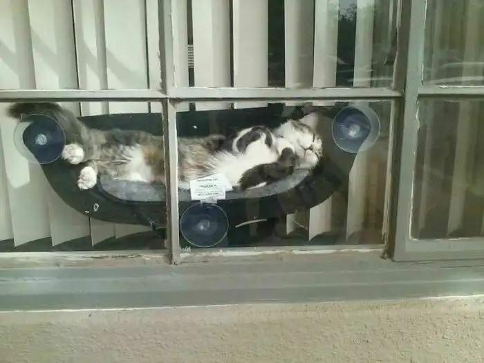 Гамак для кота на окне, где питомец любит сидеть часами