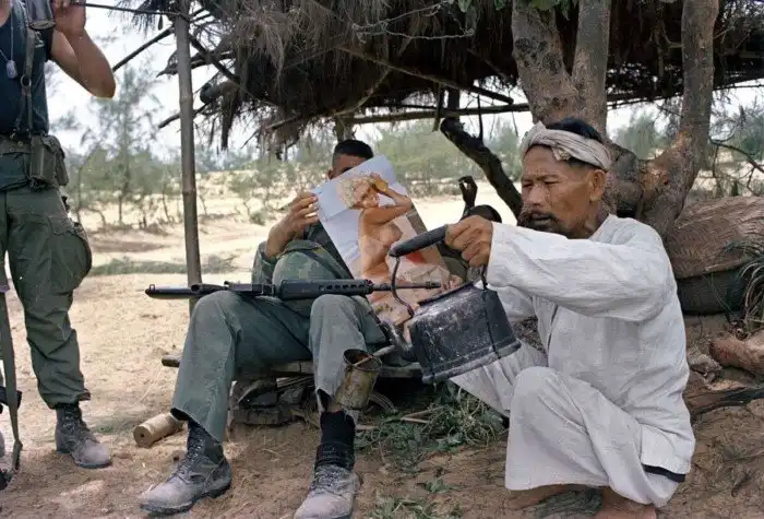 14. Вьетнамец отливает себе чаю, чтобы его снова подогреть, в то время, пока американский морской пехотинец занимается лицезрением похотливых красоток в эротическом журнале. Сентябрь 1967 года
