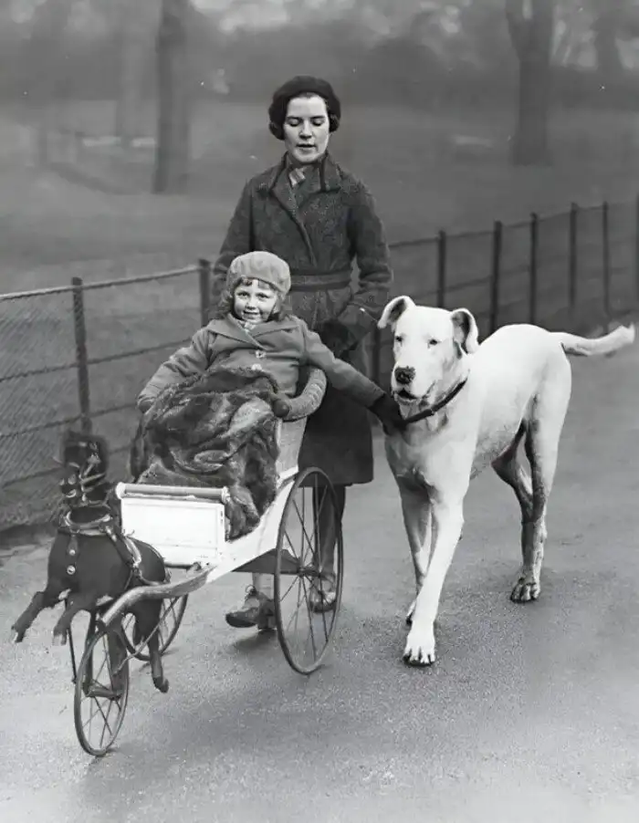 19. Маленькая девочка в коляске, смоделированной по образцу конной повозки, гуляет по Гайд-парку в Лондоне со своей матерью и немецким догом. 1932 год