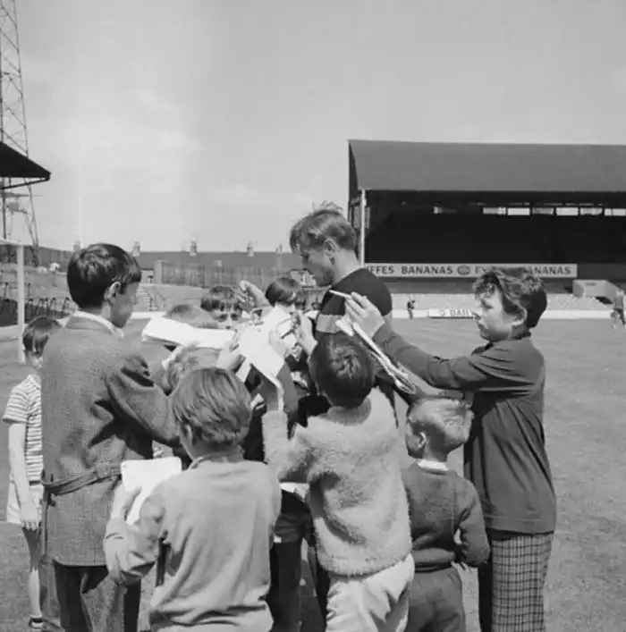 30. Лев Яшин раздаёт автографы подросткам во время Чемпионата мира в Англии, июль 1966 года