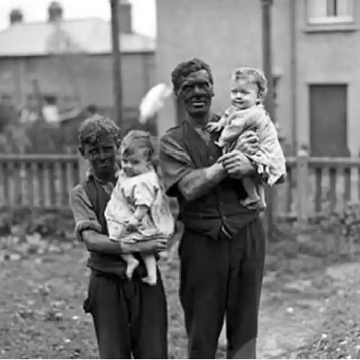 32. Отец со старшим сыном вернулись с рабочей смены из угольной шахты. Уэльс , 1931 г