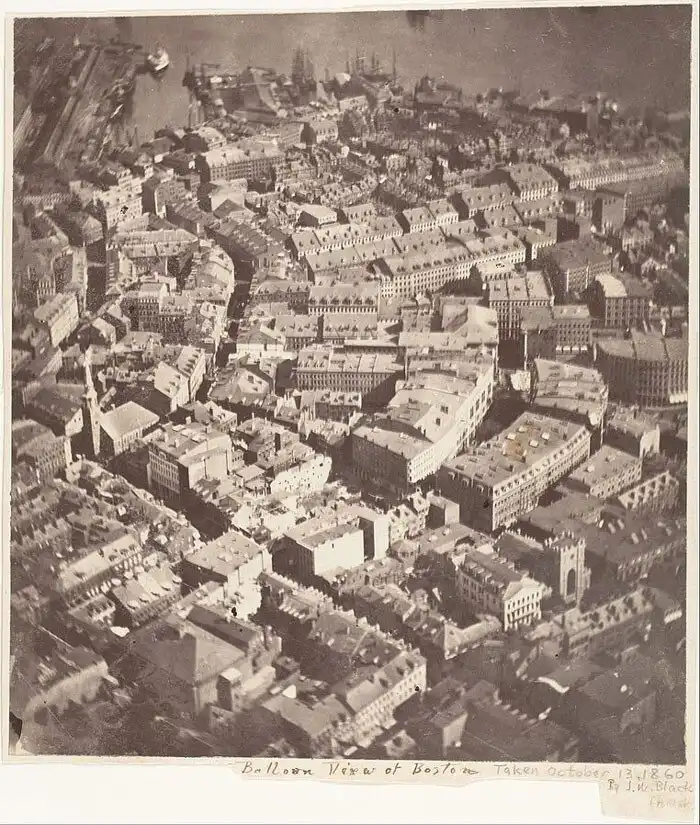 В 1860 году, задолго до дронов, с воздушного шара был сделан первый аэрофотоснимок. На нем показан город Бостон с высоты птичьего полета - то есть, около 800 метров. Фотограф Джеймс Уоллес Блэк назвал его «Бостон, каким его видят орел и дикий гусь».