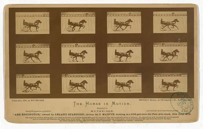 Эдверд Мейбридж был пионером в искусстве захвата движения на фотографиях с помощью набора камер, срабатывающих одна за другой. Эти покадровые фотографии, сделанные в Пало-Альто, штат Калифорния, сыграли важную роль в развитии технологии киносъемки.