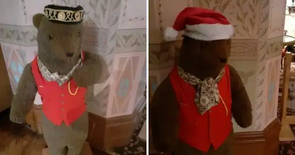 Это Рузвельт, медведь, который приветствует вас в музее замка Клифф. Он всегда опрятно одет и носит головные уборы, соответствующие сезону.