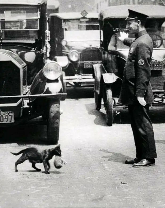 Офицер останавливает движение, чтобы пропустить мать-кошку с котёнком. 1925 год