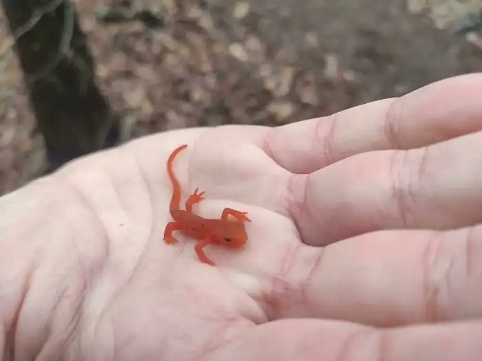 Ответ: "Зеленоватый тритон" [у молодых тритонов этого вида оранжево-красный окрас].
