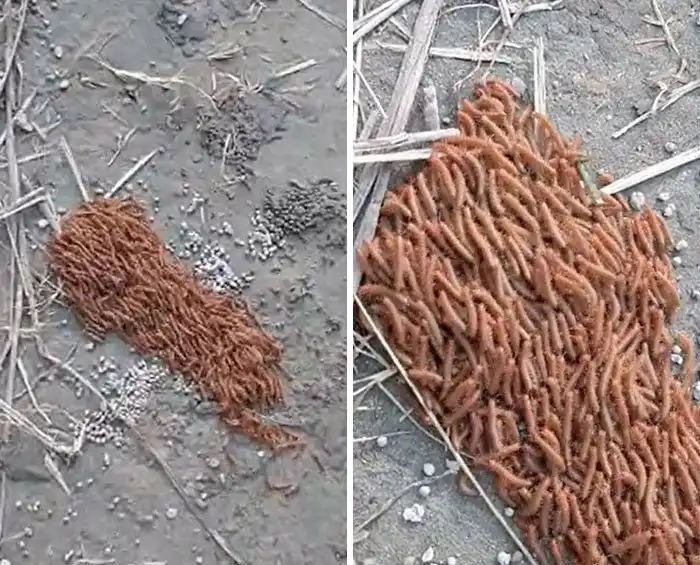 Ответ: "Это многоножки, идущие вместе. Те, что внизу, тоже идут. Те, кто наверху, идут по ним, и как только они доходят до конца, они перемещаются вниз и меняются. Они делают это, чтобы быстрее преодолеть большее расстояние".