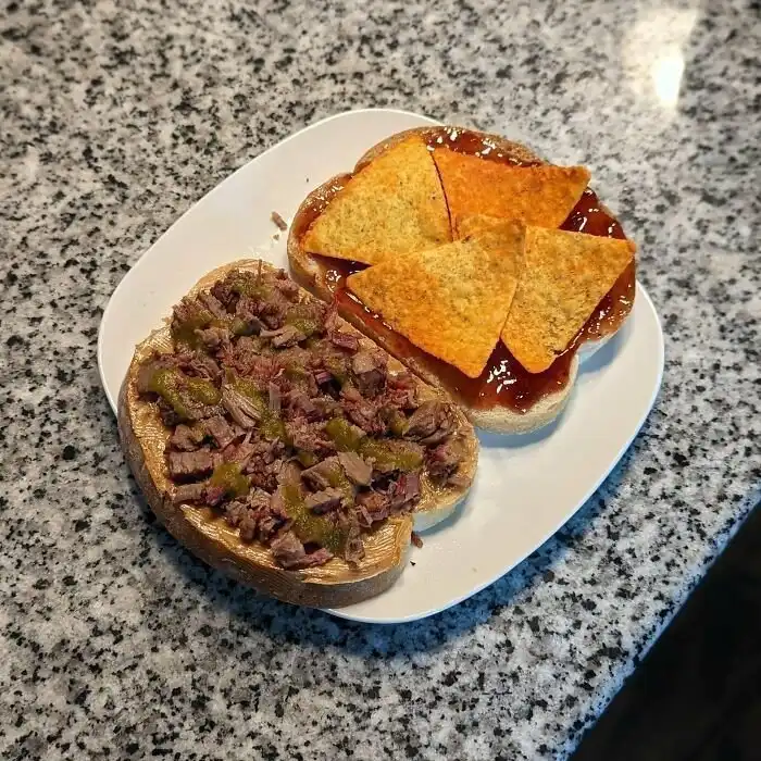 23. Арахисовое масло с джемом, говядина, перец, кусочки бекона и чипсы начос