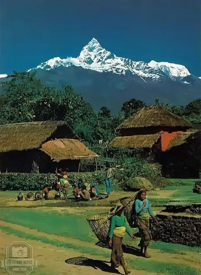 4. Деревенская сцена в Покхаре на фоне горы Мачхапухре. Открытка 1970-х годов от Hotel Crystal | Фото Шридхара Л. Манандхар