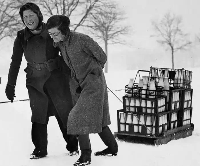 14. Две женщины доставляли молоко в Нортгемптоне на санях в суровую зиму 1947 года. Англия