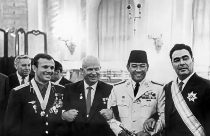 39. Юрий Гагарин , Никита Хрущев, президент Индонезии Сукарно и Леонид Брежнев , Кремль , июнь 1961 года