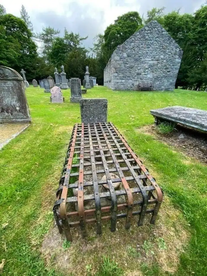 Могила Сита Мор Сгорфьяклаха в Шотландии. Клетка над могилой предназначена не для предотвращения ограбления гробницы, а для удержания на месте пяти “проклятых камней”, которые лежат на ней