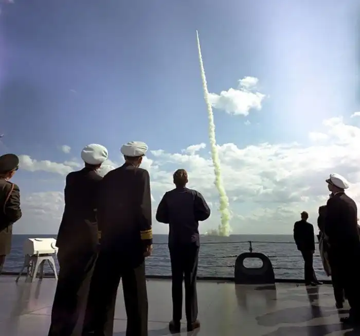 2. Президент Джон Ф. Кеннеди наблюдает за пуском ракеты «Поларис» с находящейся в надводном положении подводной лодки «Эндрю Джексон» у побережья Флориды. 16 ноября 1963 года