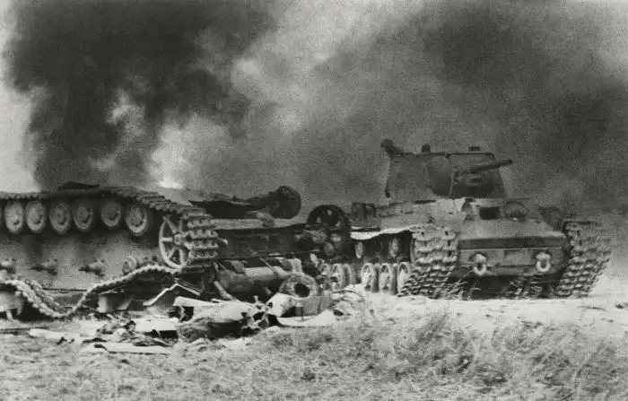 8. Советский танк КВ-1 возле подбитого немецкого танка Pz.Kpfw. IV на поле боя. Курская дуга, июль-август 1943 года