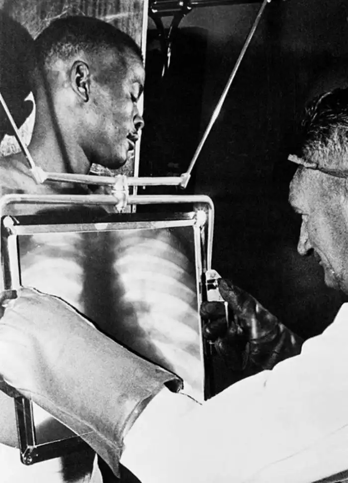 34. Рентгенолог проверяет желудок шахтера на наличие проглоченных алмазов, Кимберли, ЮАР, 1954 год