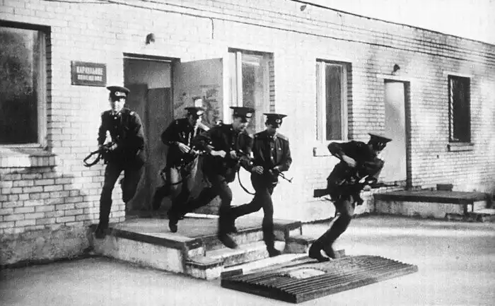 35. Отдыхающая смена караула выдвигается по сигналу "Боевая тревога" к месту нарушения. 1973 год