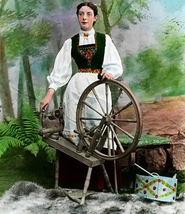 38. Женщина в национальном костюме с прялкой. Норвегия. 1907 год. (фото раскрашено)