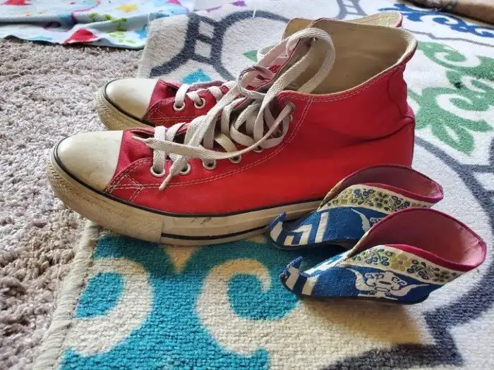 24. "7,5-сантиметровые туфельки "золотой лотос" для взрослых женщин с забинтованными ногами рядом с моими кедами"