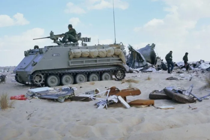 22 февраля 1973 года. Синайский полуостров. Израильские военнослужащие охраняют обломки самолета рейса 114 Ливийских арабских авиалиний (LN 114), сбитого израильскими истребителями. Погибли 108 человек из 113, находившихся на борту.