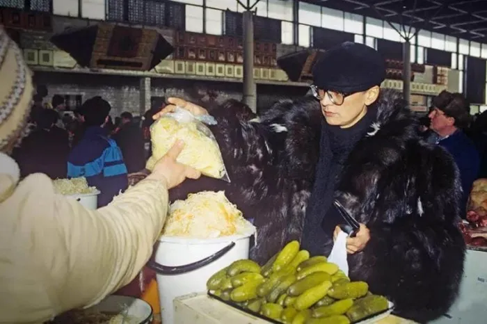 Ирина Хакамада приобретает на рынке квашеную капусту, Москва 1994 год