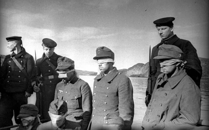 Моряки Северного флота и группа пленных немецких горных стрелков. Мурманская область, 1942 год